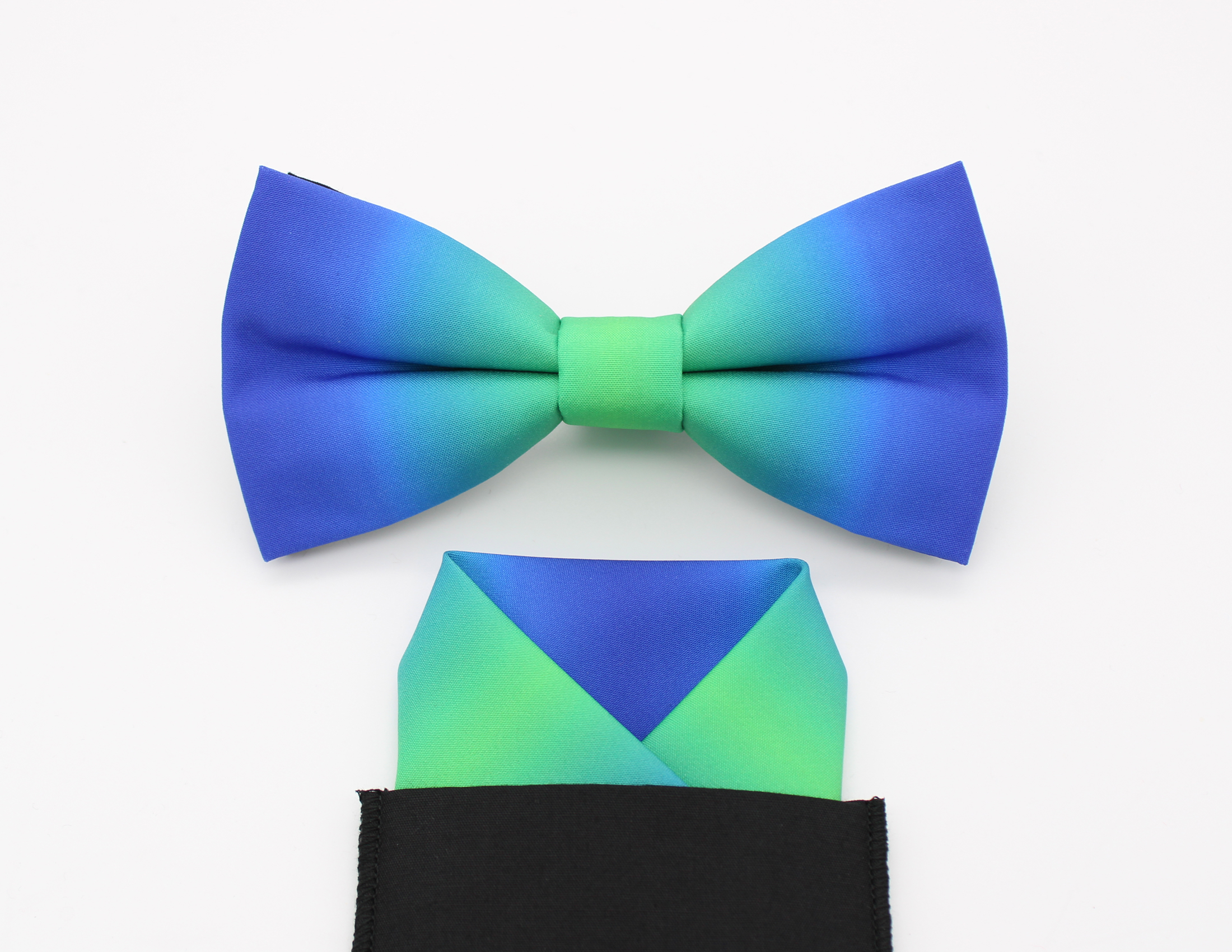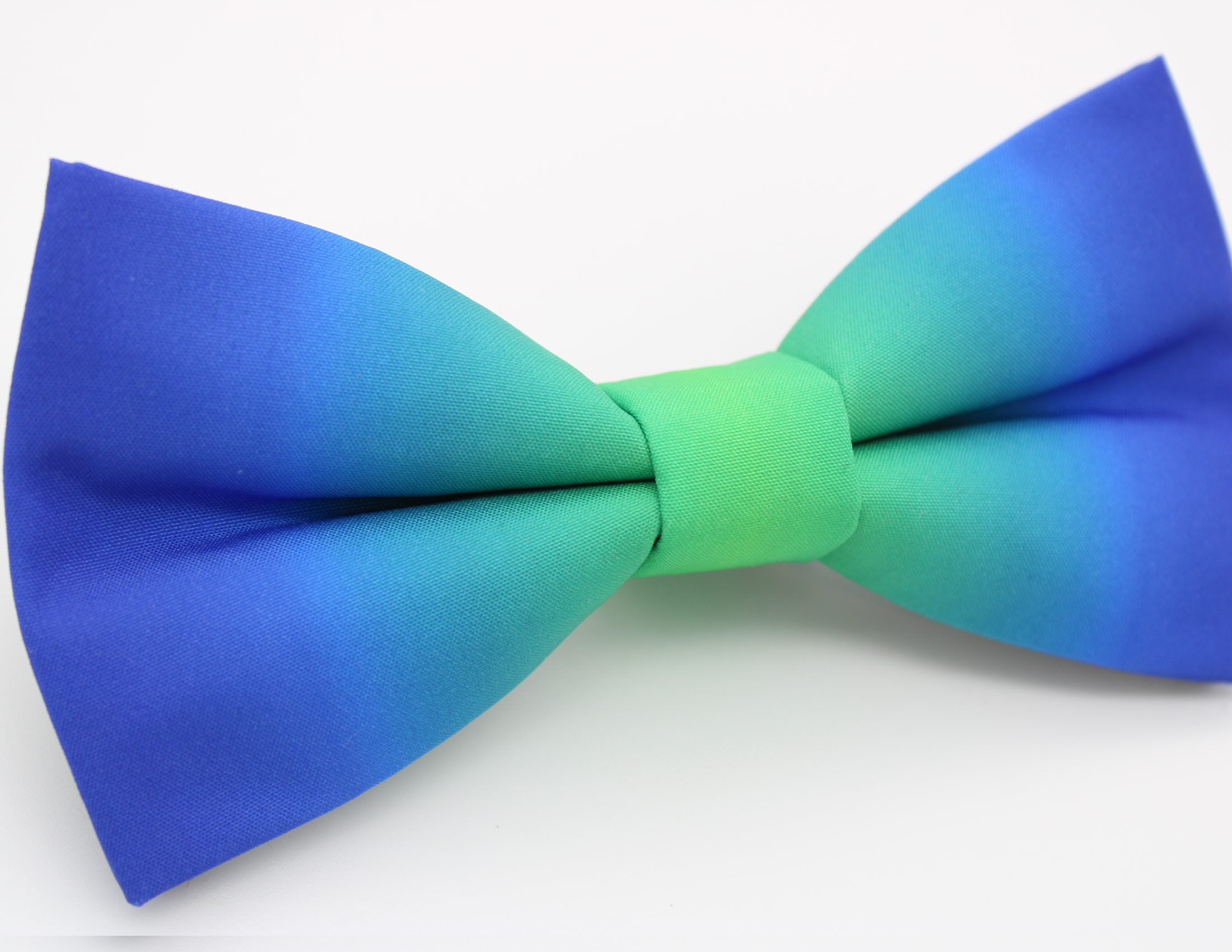 A striking ombre bowtie featuring rich blue tones that softly fade into vibrant teal and green through the centre. A bold yet refined accessory perfect for weddings, formal events, or adding a modern splash of colour to your outfit.