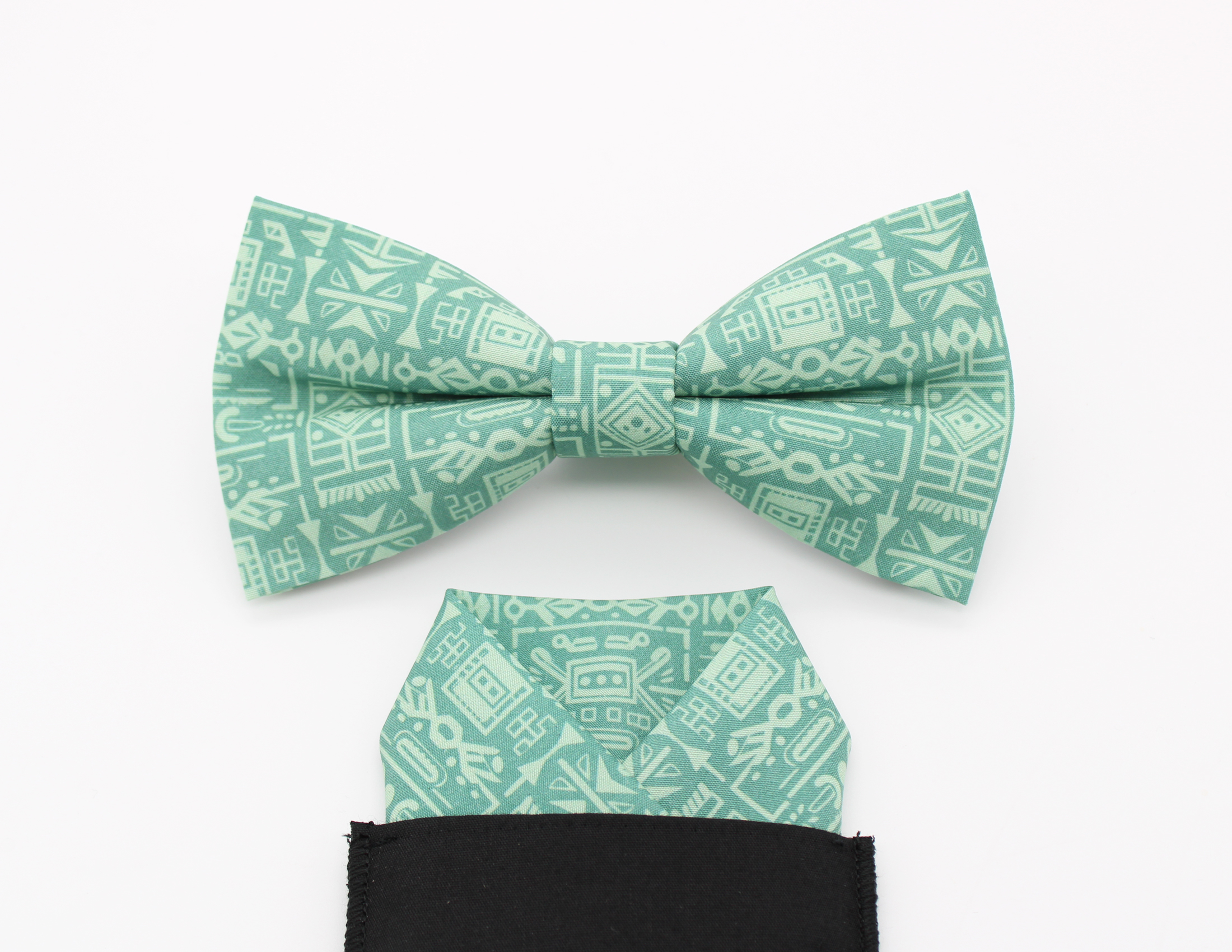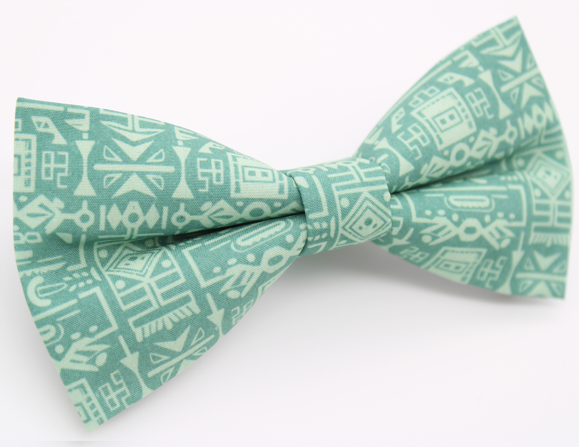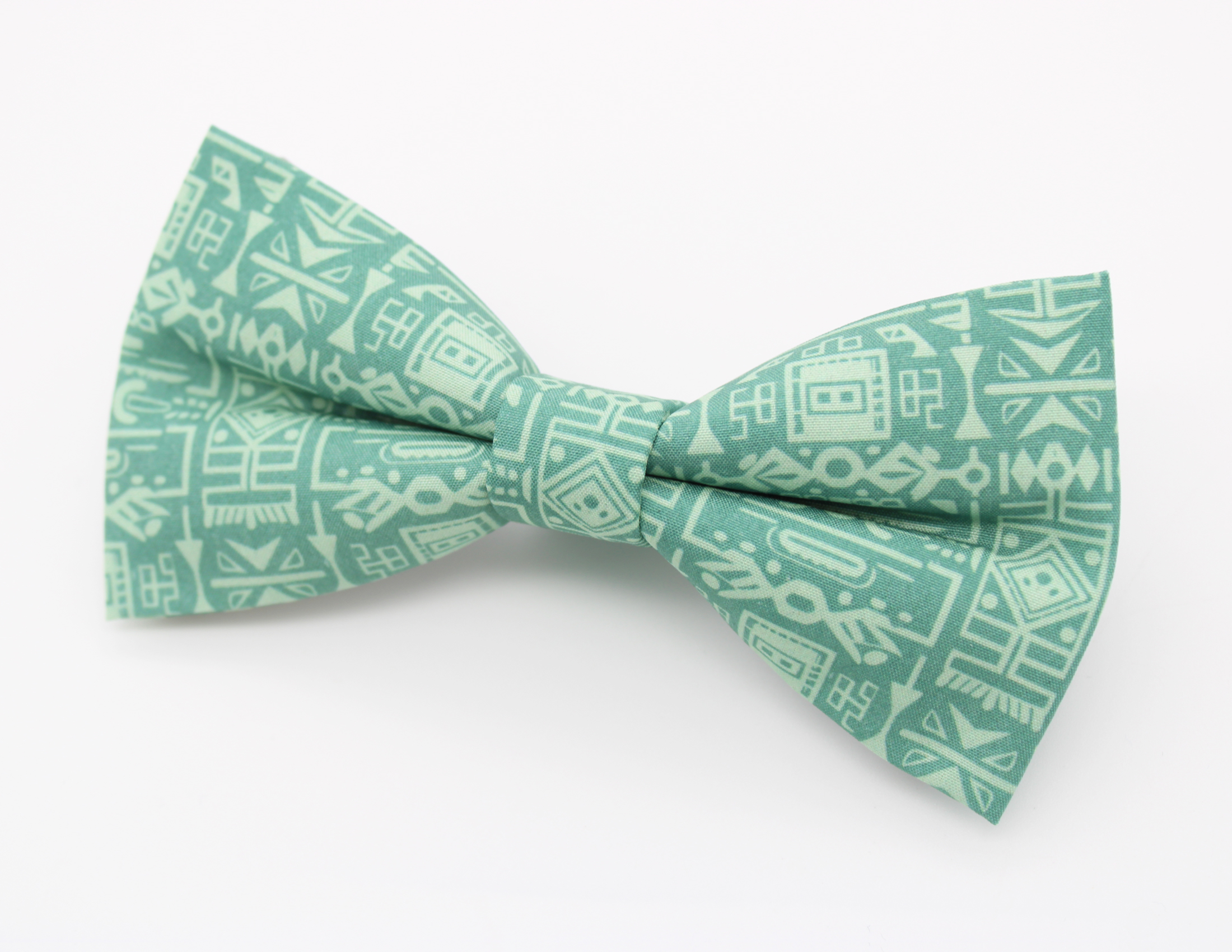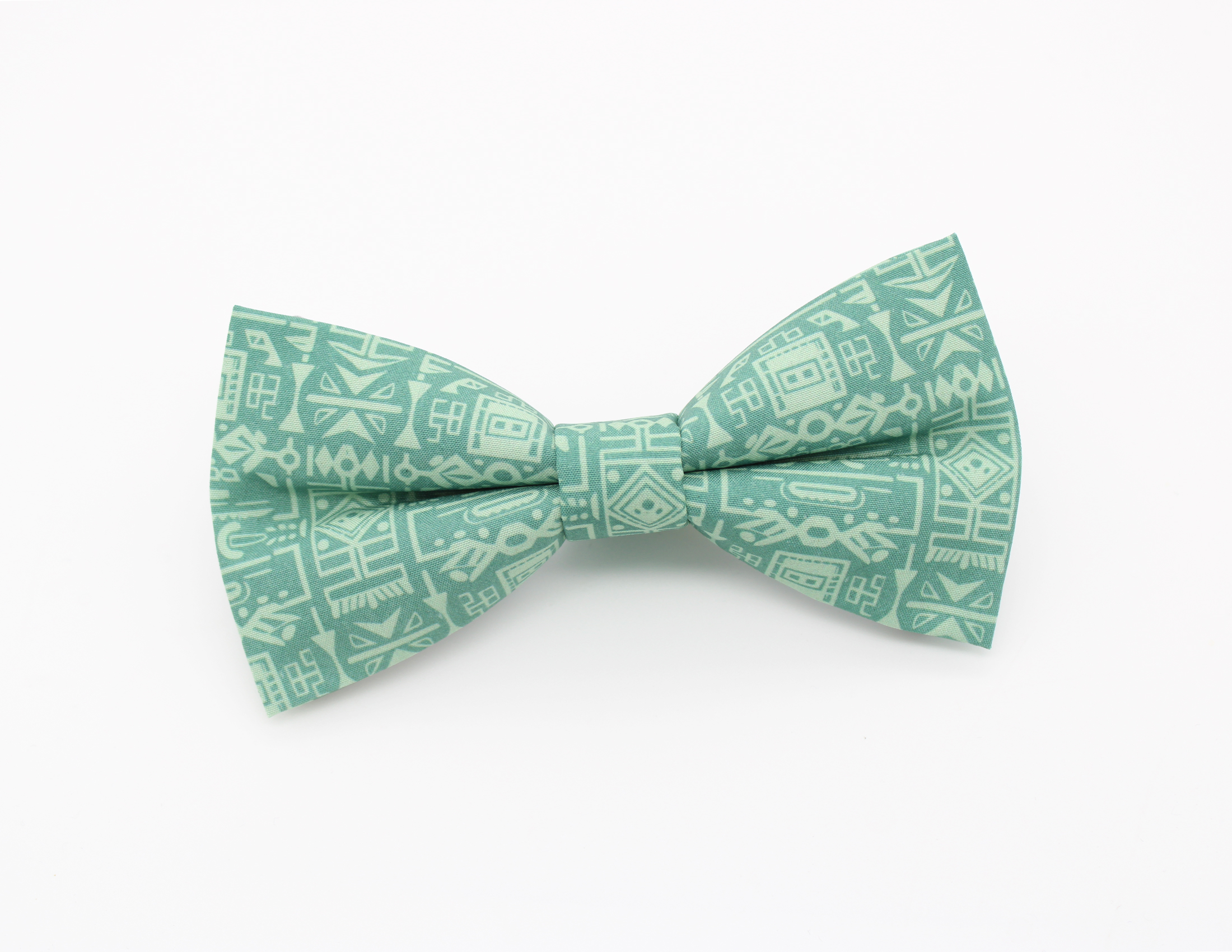 A beautiful green bowtie featuring a bold geometric tribal-style pattern in soft contrasting tones. A stylish statement piece perfect for weddings, summer events, or adding a modern graphic touch to formalwear.