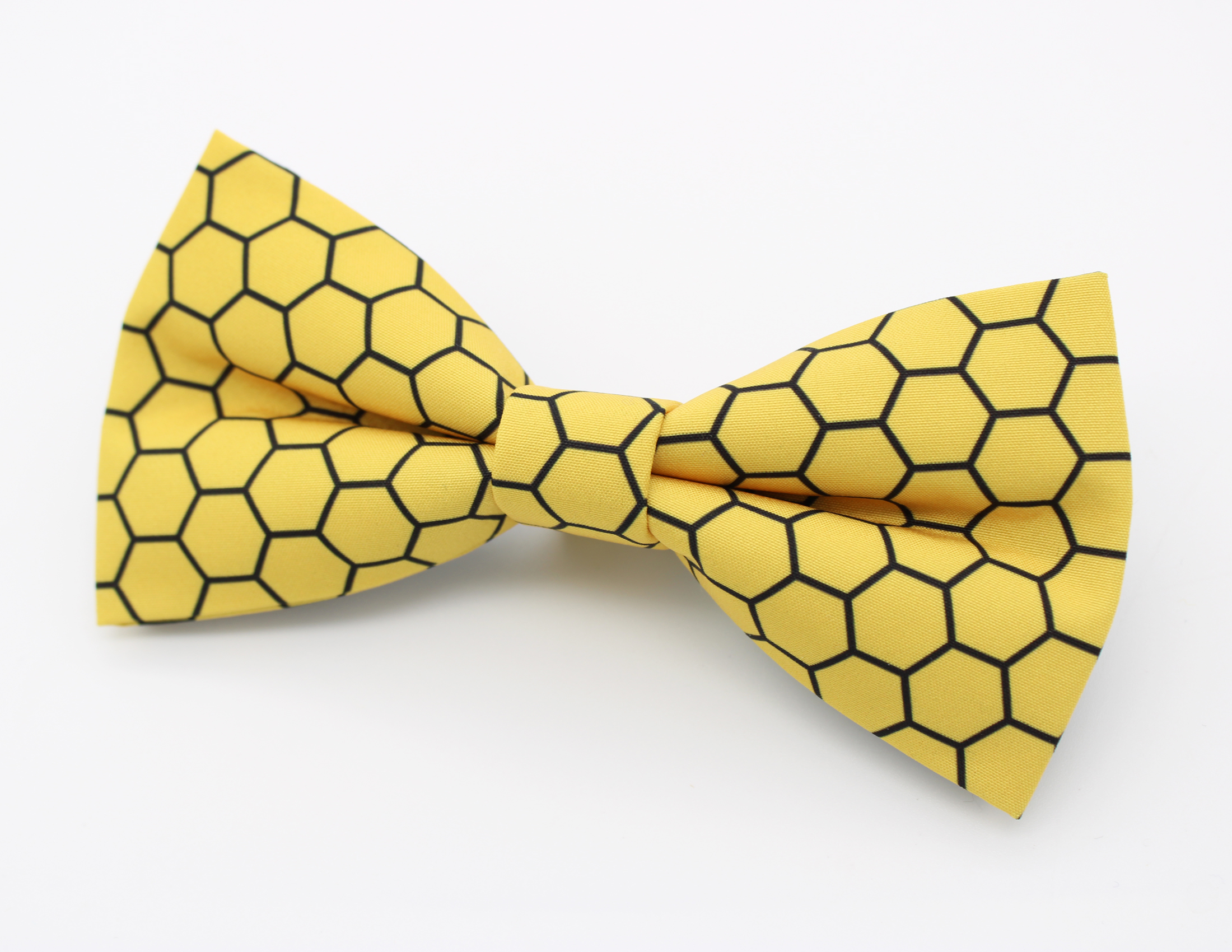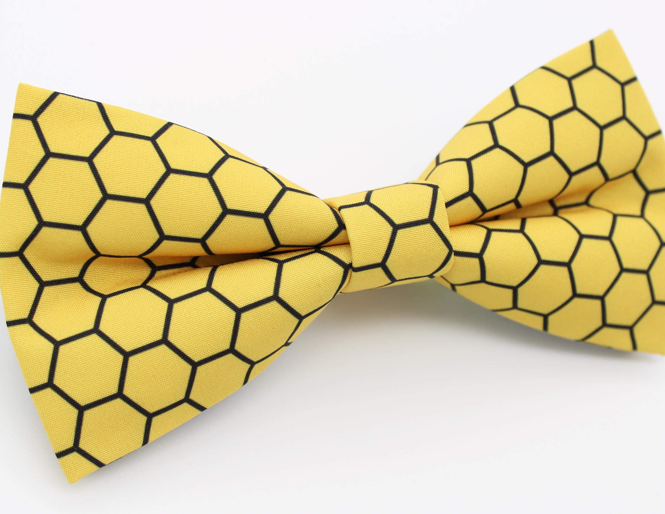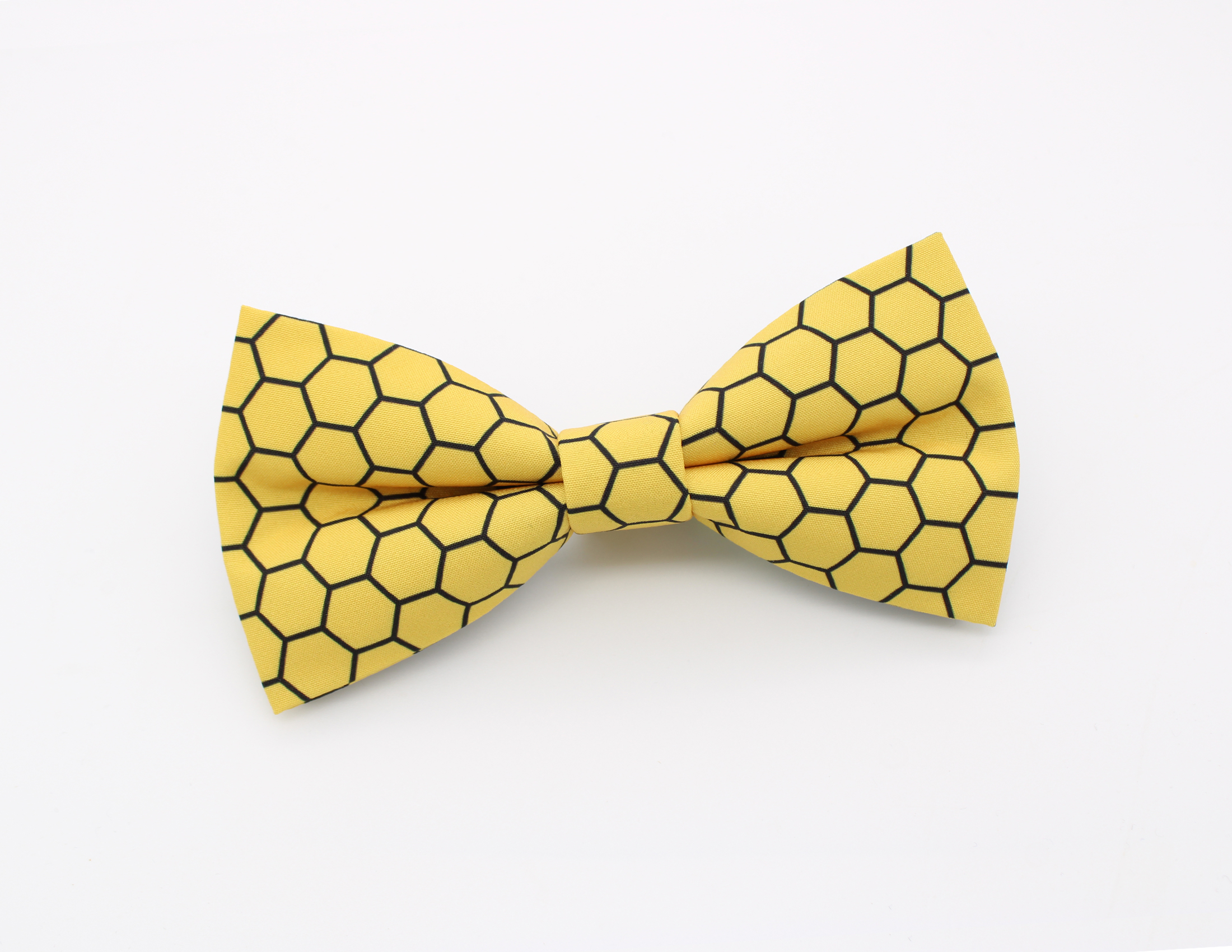 A bright yellow bowtie featuring a bold honeycomb hexagon pattern inspired by natural bee hives. This fun geometric design makes a great accessory for beekeepers, nature lovers, or anyone who enjoys unique patterned bowties.