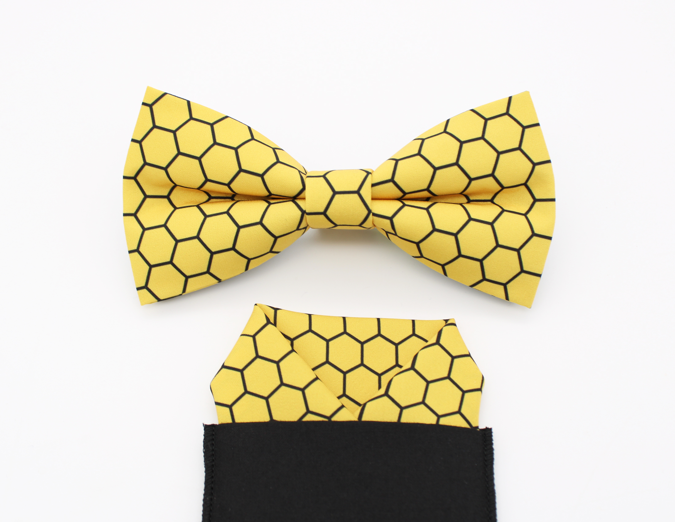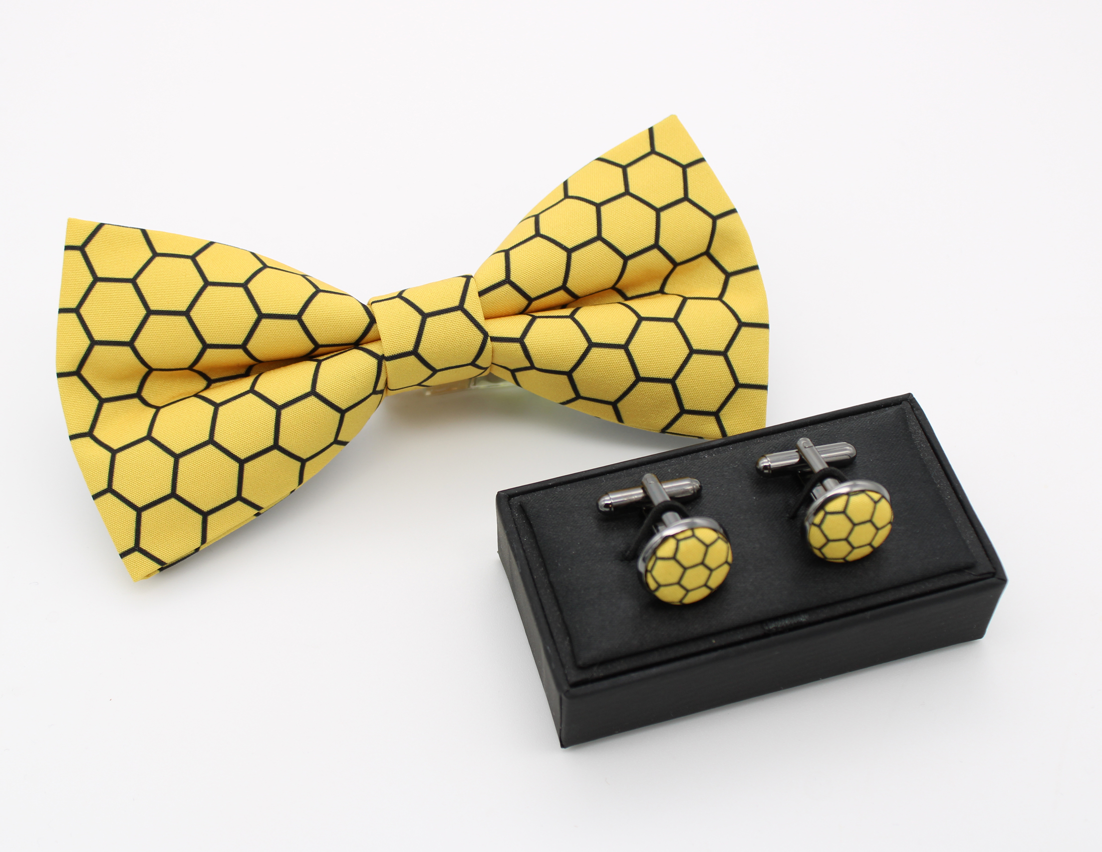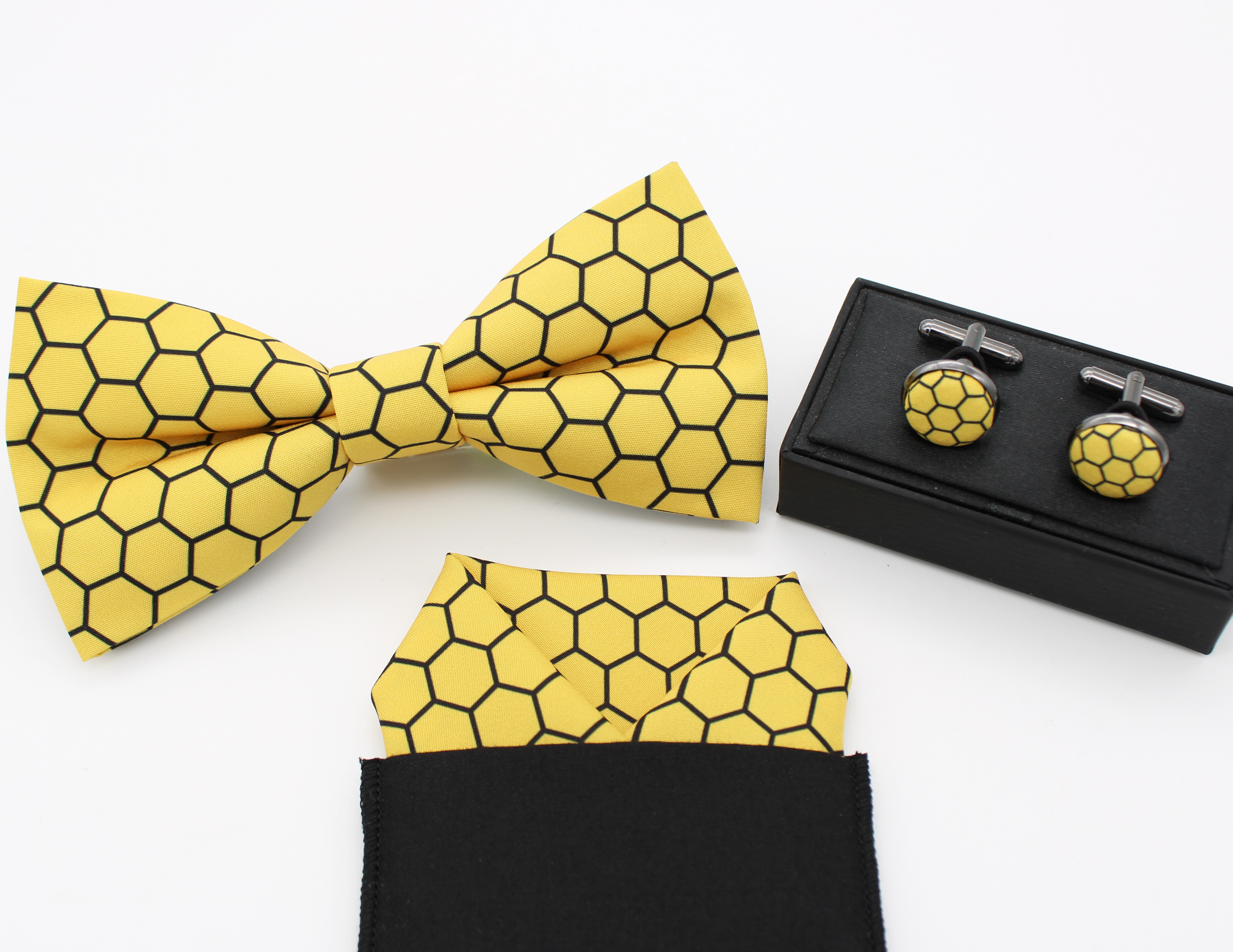A bowtie, faux pocket square and cufflinks are available in this vibrant honeycomb pattern.